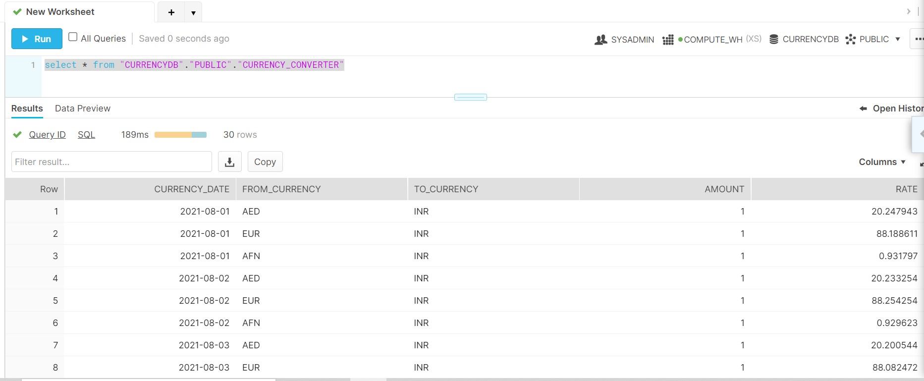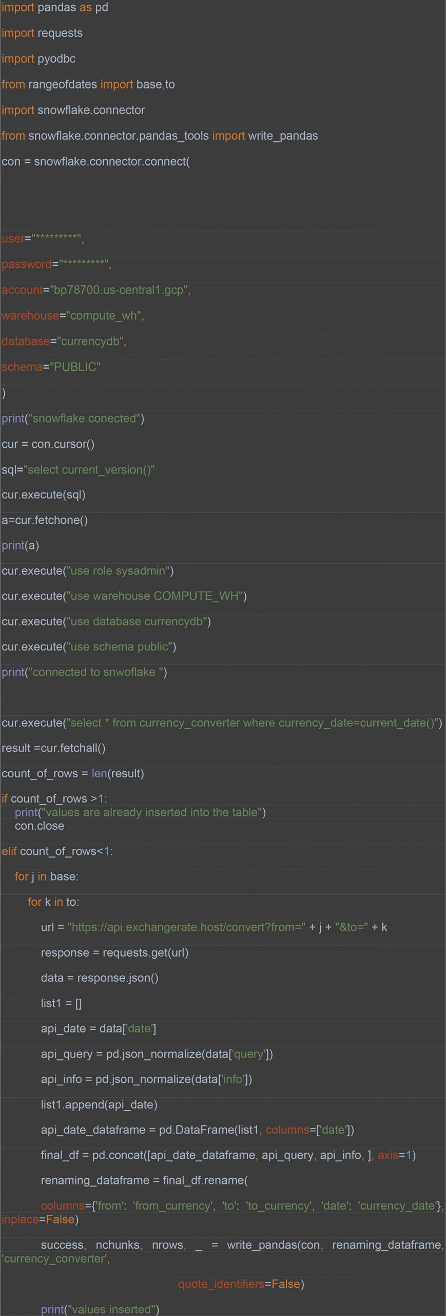 Purpose of the Article: To analyze the value of the currency in every country and query the same. we also established connections between API and PyCharm and also between PyCharm and SNOWFLAKE