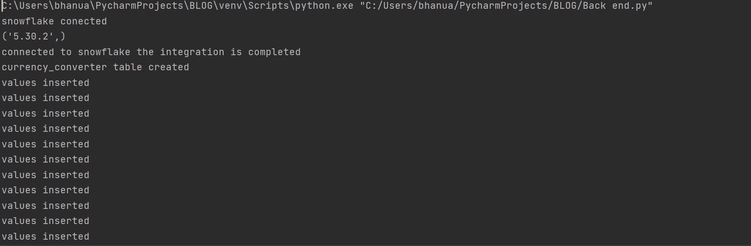 After the successful integration of PyCharm with Snowflake, we can see the above image when the data is inserted successfully.