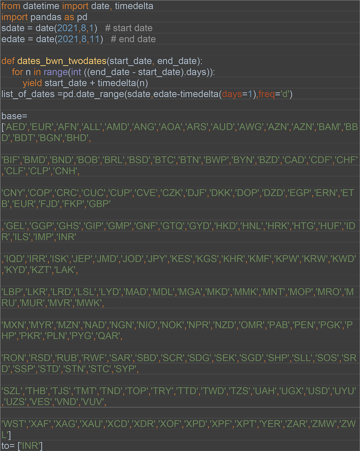 We use Python code to apply transformations to the above data, which gives us the exact filtered data we need. Using this code, we get the currency values of historic and current dates.