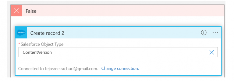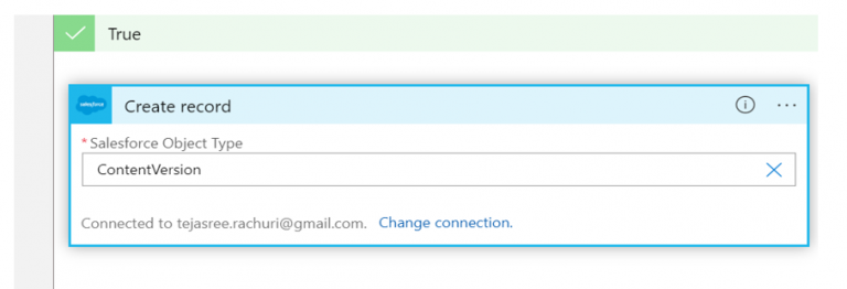 Create record: In the true condition, I’m taking ‘create record’ connector from Salesforce and object type as content versions (we can store files and attachments in Salesforce) and added parameters such as title, path on the client, and version data.