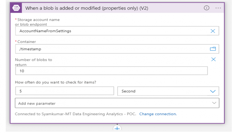 When a blob is added or modified in Salesforce, it will trigger the flow. Add the storage account name and container name to it.