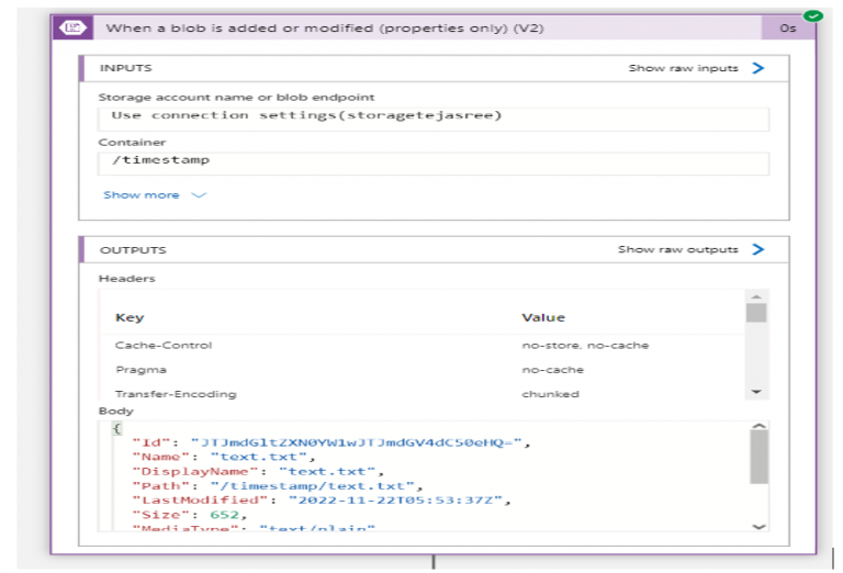 This is the output of the storage account (Tejasree) and the container (timestamp). The updated or modified files should display to that azure blob storage.