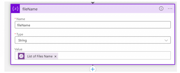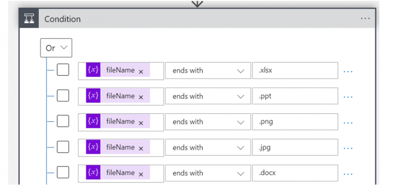 Condition: I am differentiating the files based on file types by using a condition connector. If the file path ends with .pdf or .xlsx files, the true condition will be satisfied. In the true condition, we are storing the file data which is getting from HTTP as $content.