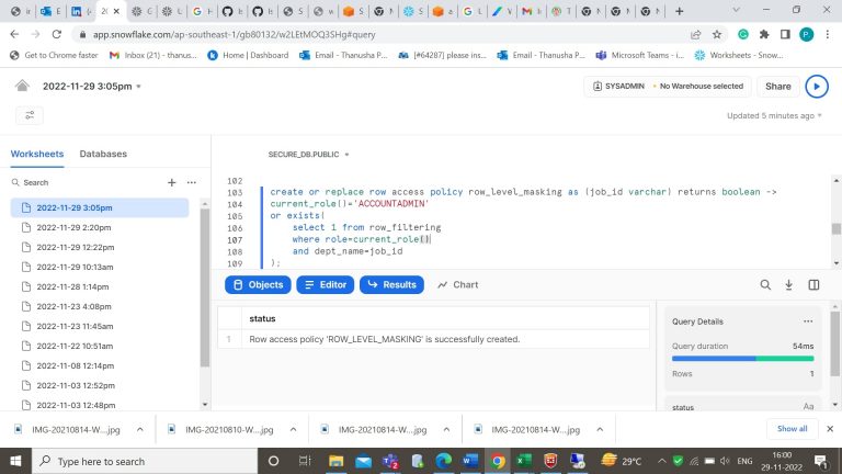 - Step-11: Now let’s create a row access policy for a column in the table (datamask). Here we have created a row access policy for a job_id column in the datamask table.