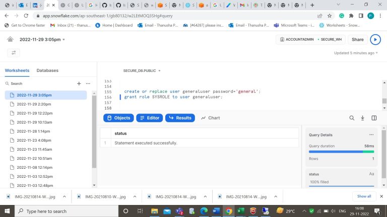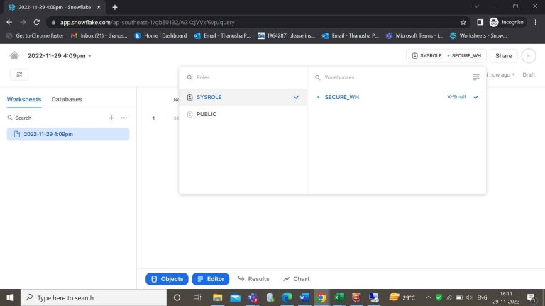 - Step-21: Within the worksheets, you can see the role and warehouse of a generaluser. Here for SYSROLE role I have assigned all the dept_names.