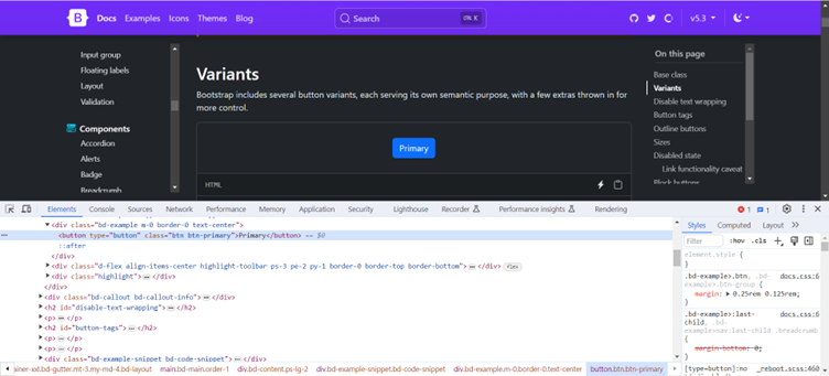 Bootstrap provides a set of pre-defined classes that are specifically designed to style various elements. These classes are applied directly to HTML elements, such as `<div class=”btn btn-primary”>`. When using Bootstrap, the classes contain readymade styles that are immediately applied to the elements, and you can see the visual changes instantly when you apply or remove classes using the browser inspector.