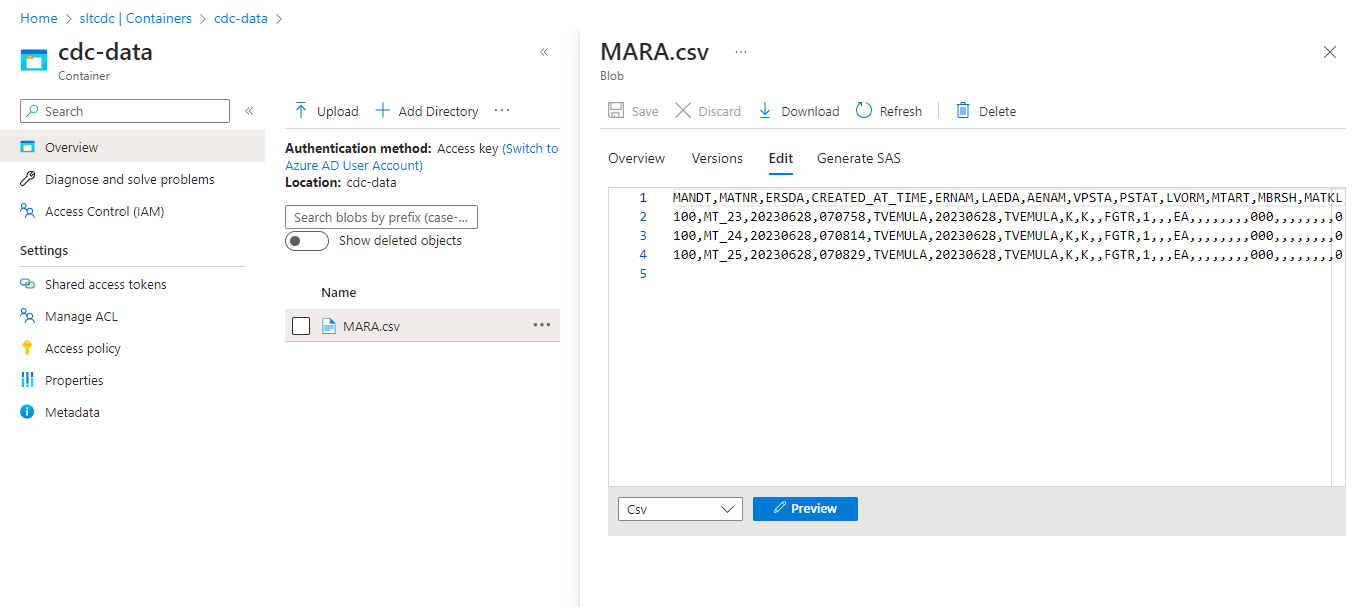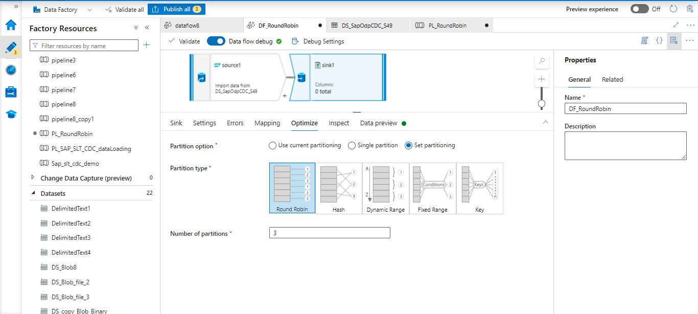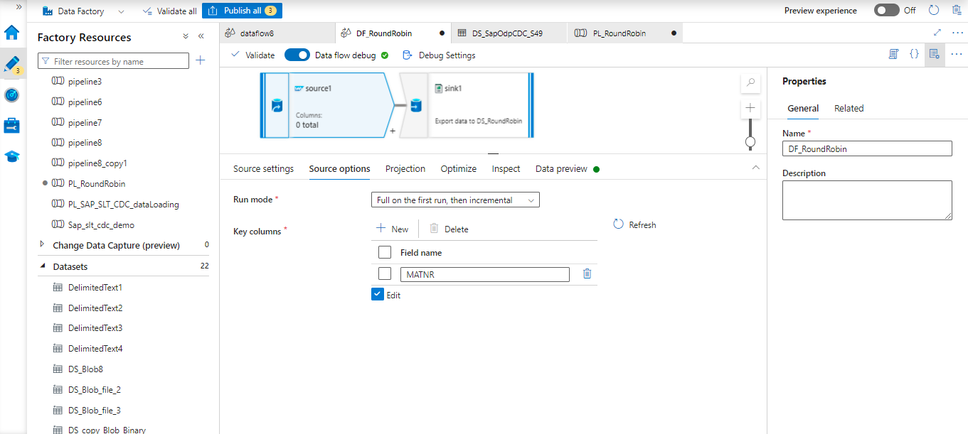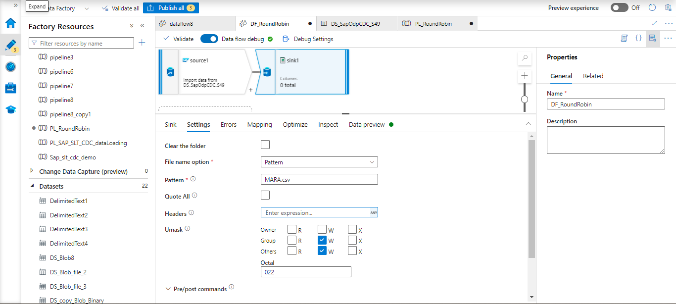 Here is the Azure dataflow with SAP CDC connector. The source and sink are configured as mentioned below.