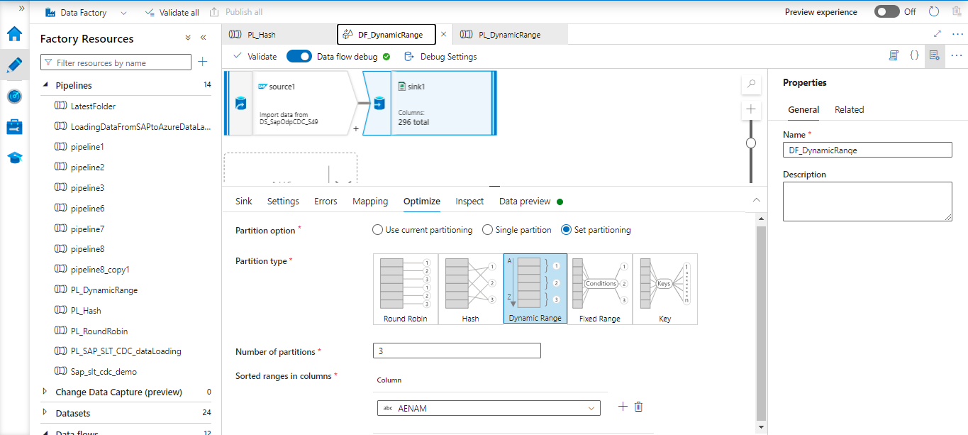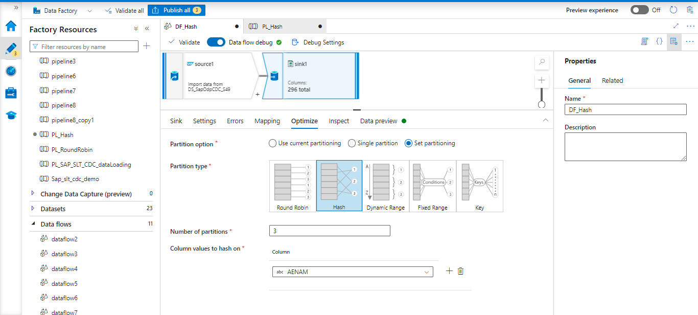 Every data flow transformation contains a tab that asks whether you want to partition the data when the transformation is finished. The Spark cluster’s partitioning scheme can be configured using the parameters on the Optimize tab. Changing the partitioning gives you control over how your data is distributed among compute nodes and enables data locality optimizations, both of which can improve or degrade the speed of your data flow as a whole.