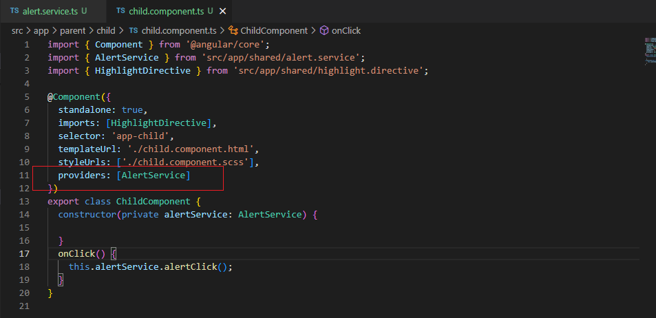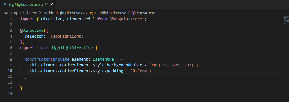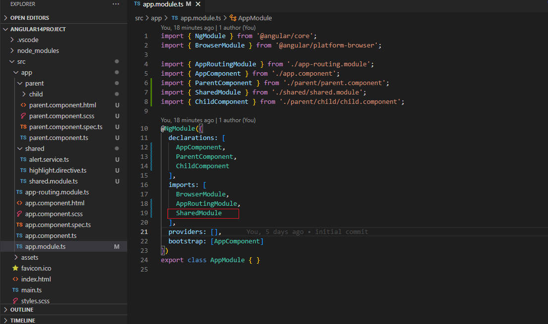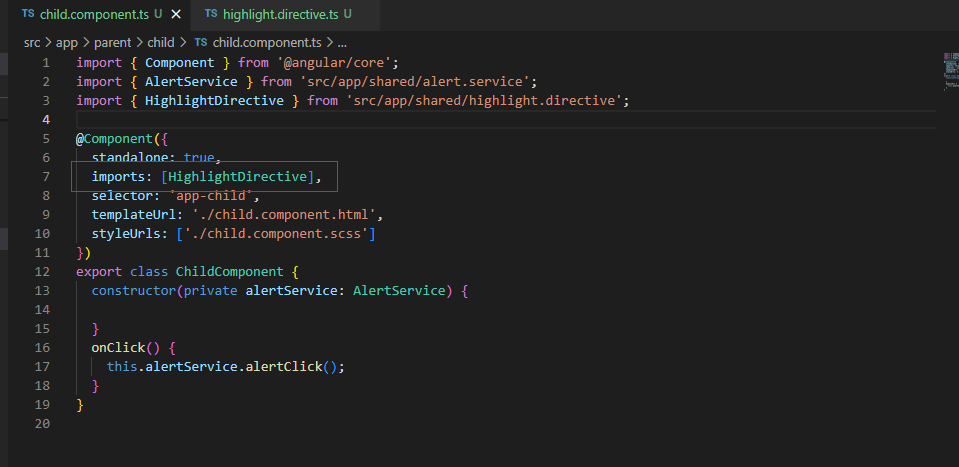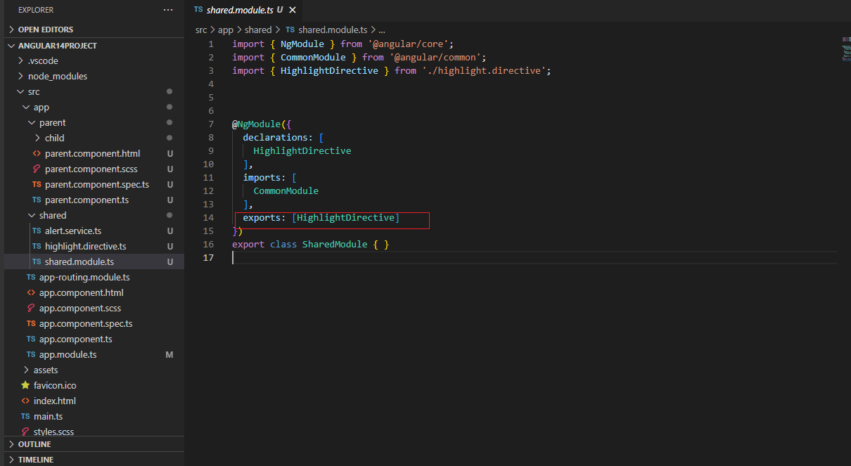 Ensure to include the shared module in the app module and export the highlight directive in the shared module. You can remove the alert service spec file and highlight the directive spec file, as we will not use them here.