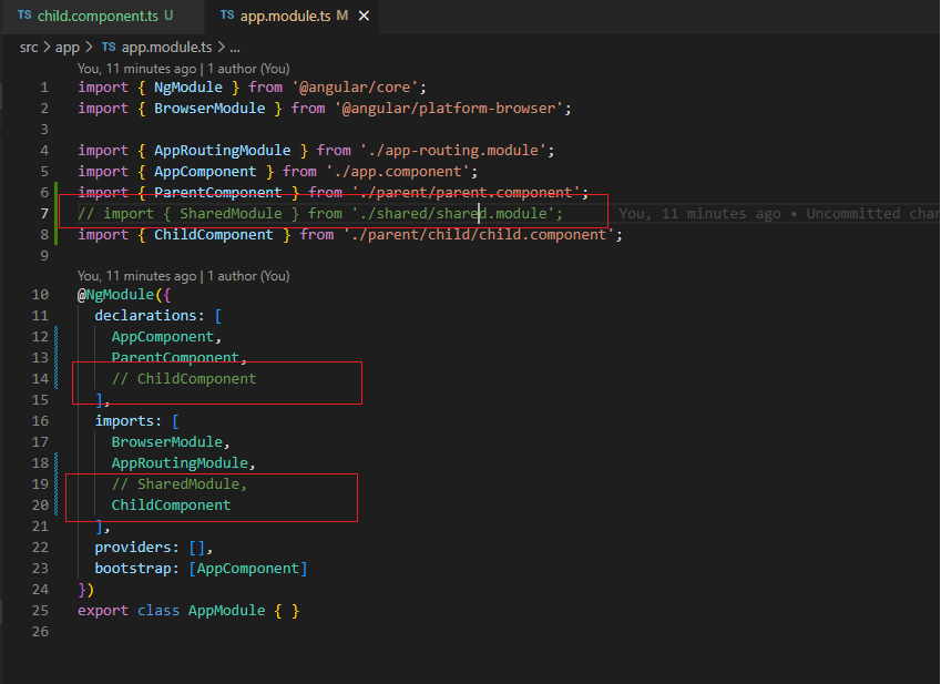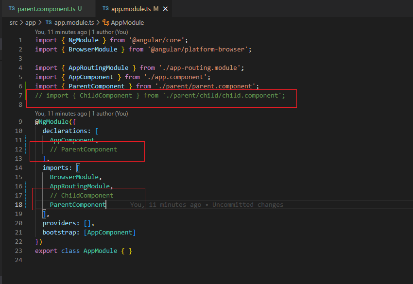 Remove the Parent Component from the app module declarations array, as we don’t need it anymore.