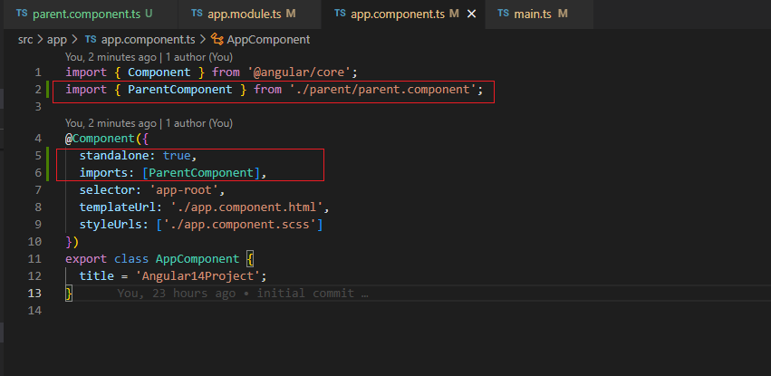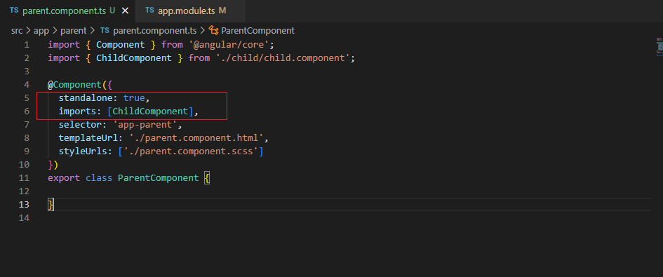 Similar to the child Component (which we made Standalone in the previous sections of this article), We can convert the Parent component into a Standalone part by setting its standalone property to true. You can use a standalone element for another component by passing it to the import’s property of that standalone Component.