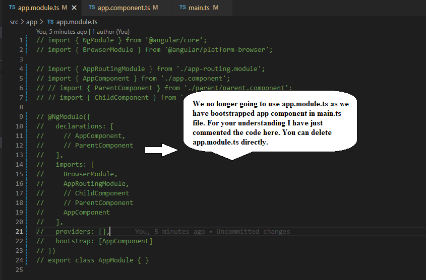Then we have to include our root component (i.e., app component) in the main.ts file. Then eradicate the App module.