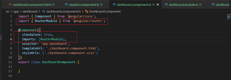 Include Standalone property to true in Dashboard Component file and Router Module from angular core in imports array.
