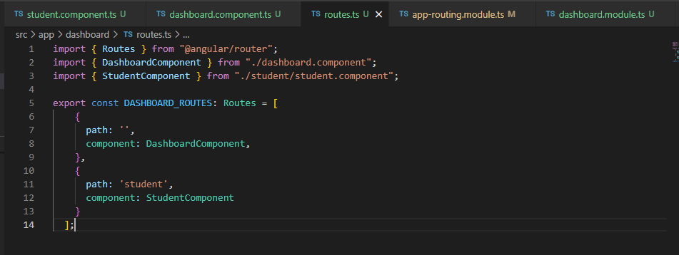Create routes Ts file in the dashboard Component folder where we configure the routes with student route navigating to the student component as below:
