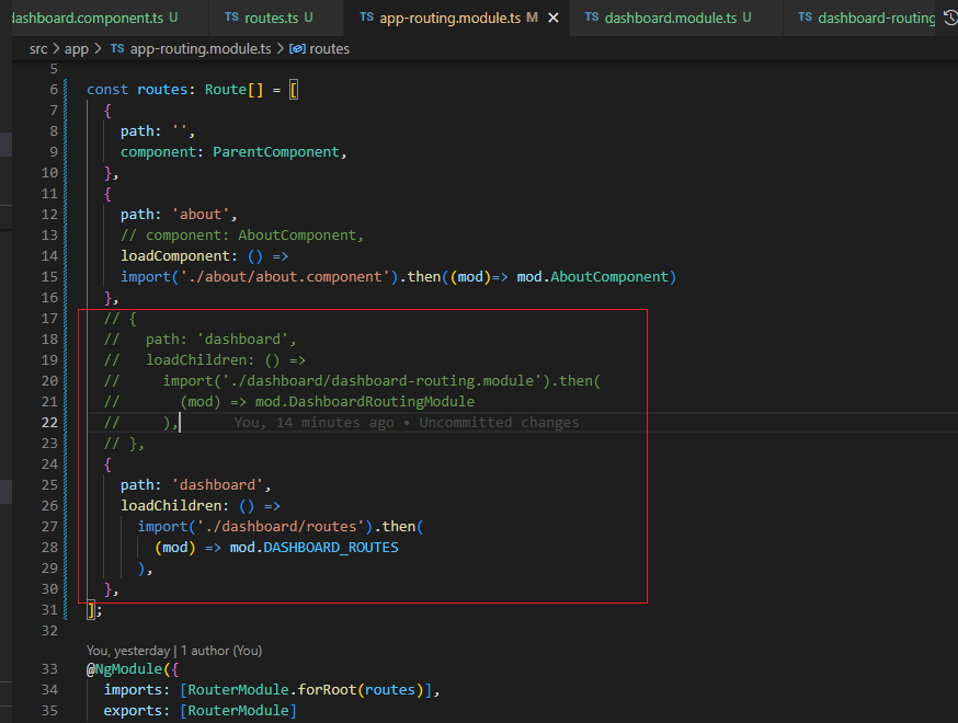 We MUST remove the connection between the dashboard routing module and the app routing module for dashboard navigation and replace it with the routes constant we recently created.