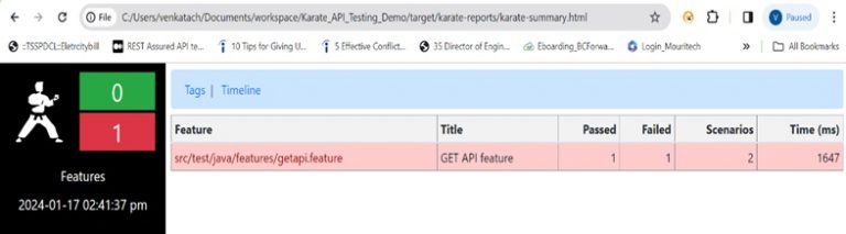 Reports: Karate provides detailed HTML-based reports which include request and response details, assertions, and even screenshots to quickly identify issues.