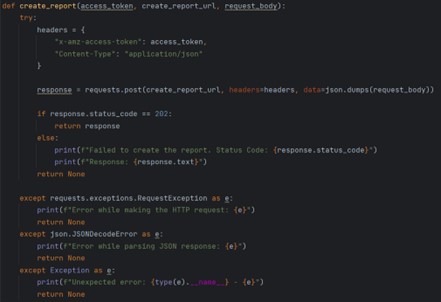 In this step, we employ the POST method, utilizing a temporary access token for authentication. The request body, formatted as raw data, includes the report type, marketplace IDs, start and end dates, and the report period (week, day, year). https://sellingpartnerapi-eu.amazon.com/reports/2021-06-30/reports