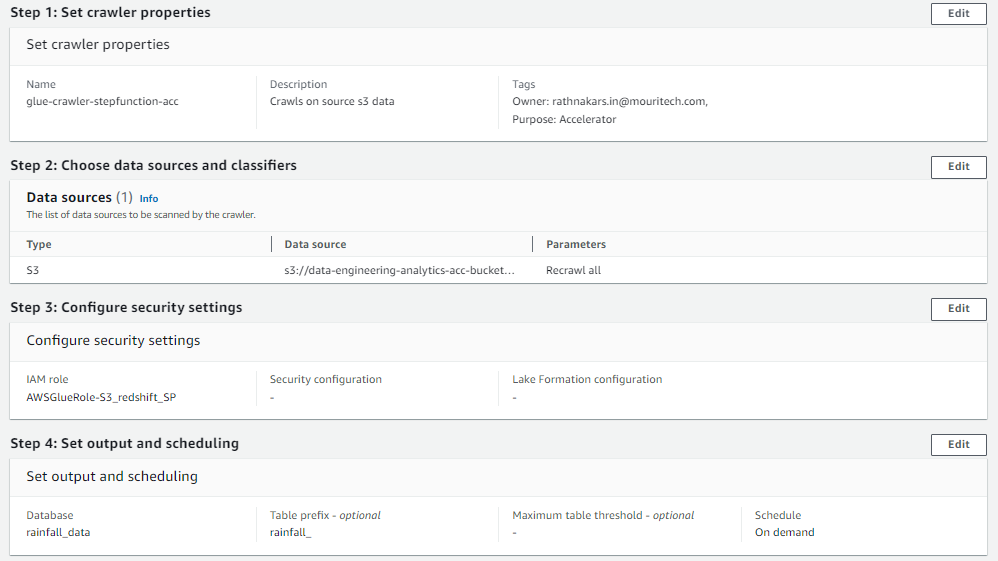 - Running of CRAWLER: Create a GLUE crawler that points to the CSV data stored in S3 (images below show a preview of a basic crawler’s appearance).