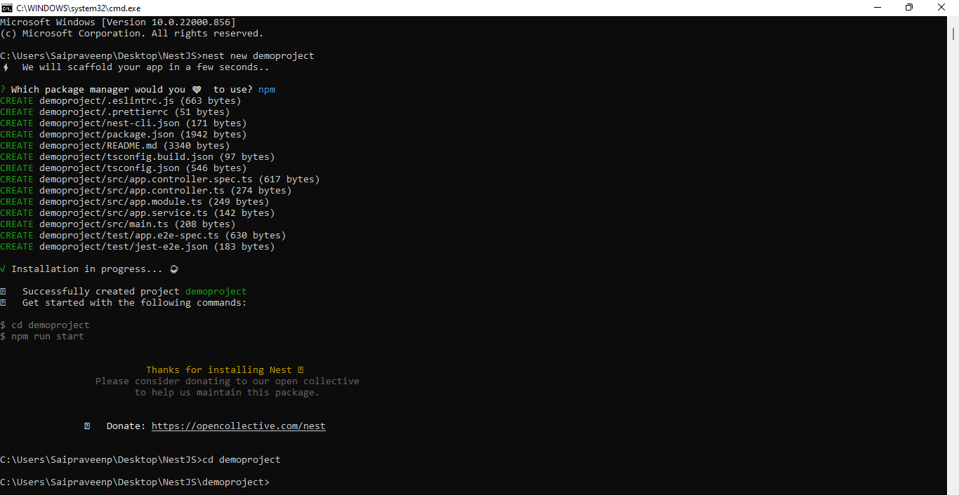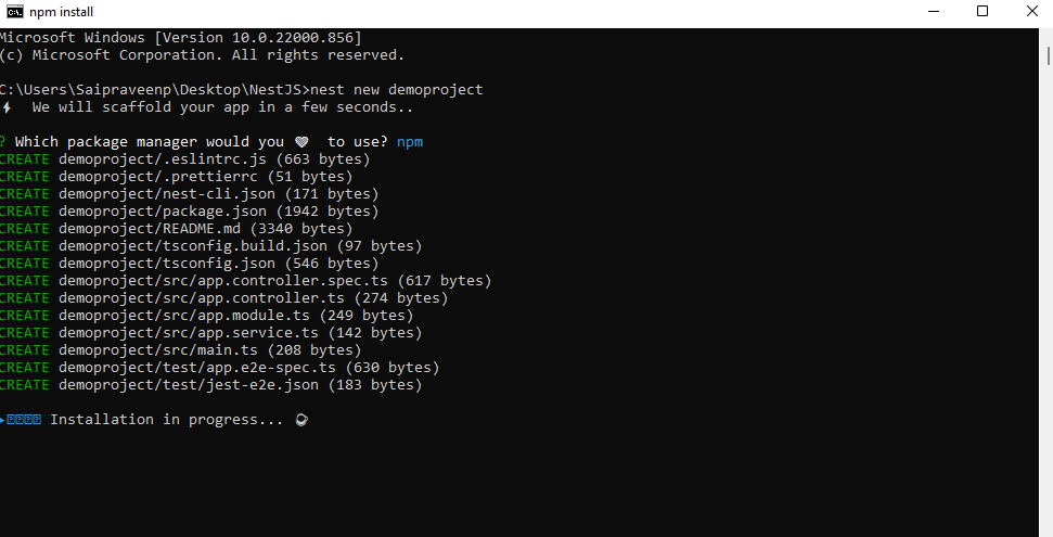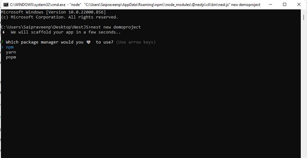 • Enter command nest new demo project. Then, click enter.. Next you can see the screen