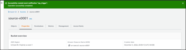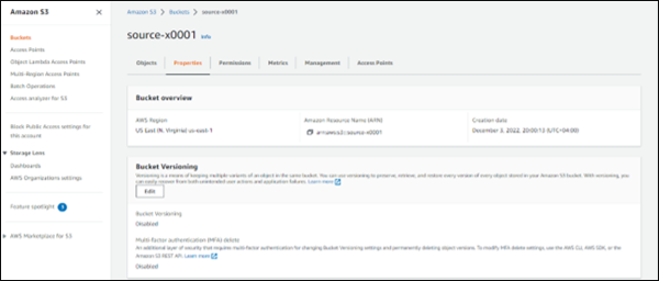 - Open the S3 Bucket that we created. Choose the Properties option. You will see the view below.