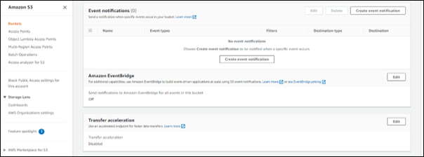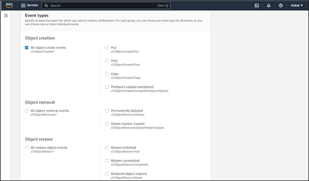 - In the event kinds,choose the option to create events for all objects. If any file is placed in the S3 bucket, the event information will be generated.