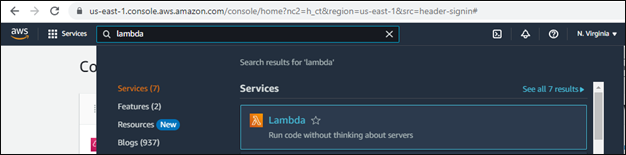 - If you search lambda in the service list, you will see the lambda service, as seen in the screenshot below.