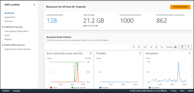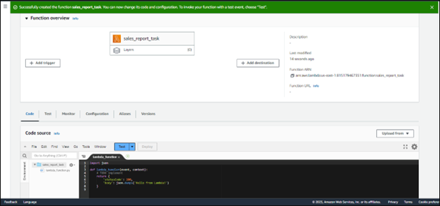 - Choose the Create Function option. Your function will be ready. The common lambda handler template is shown in the code source. There, you must build your own unique utility Python code, and you may trigger depending on events or plan time intervals.