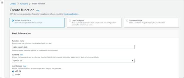 - After selecting the create function,we must create a lambda function. We’ve provided the key information, such as the function name and runtime, below. NOTE: At runtime, we are using a Python script.