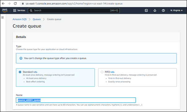 2. The Standard queue type is selected as the default for Type. Choose FIFO to build a FIFO queue.