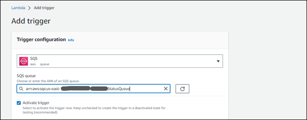 - You will be sent to the trigger configuration page. Choose the SQS service first, and then pick your Queue that you built in STEP – 1. And select add your trigger button. Your SQS trigger will be added to your Lambda function.