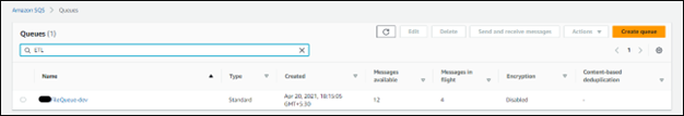 A snapshot of SQS Queues. Messages are made available based on file upload events to the S3 bucket.