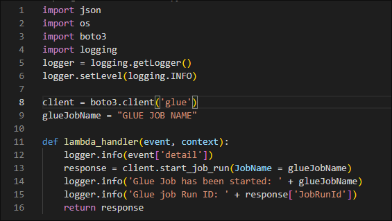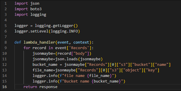 - The Python script that follows receives the SQS message and parses the bucket and file names. We may take these parameters and provide them as inputs to any jobs that do file read operations. Under the Lambda handler, you may write custom code, functions, and utilities. You can do the jobs based on the criteria.