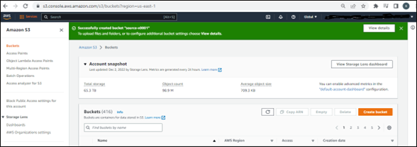 - You will get a pop up that says ‘successfully created bucket with your bucket name’, as shown in the screenshot below.