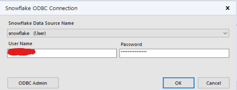 - After selecting the set-up connection, we must select the Snowflake ODBC driver from the data connection, and then a pop-up window will appear, as shown in the image below. Enter your Snowflake username and password, then click ‘OK.’