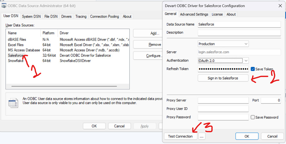 >> When you click ODBC, a new tab will open the ODBC data source administrator there we need to select Salesforce after that it will ask for your Salesforce credentials (username, password, refresh token) to connect to Salesforce, as shown in the image below. After a successful test connection click on ok.