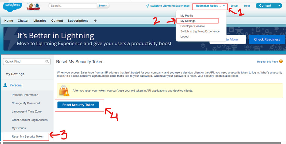 Token Generation: Go to the Salesforce developer account and select your profile name, select my settings >> then click on ‘refresh my security token’ >> then click on ‘Reset Security Token’ as shown in the below image. It will send you the token to registered mail.