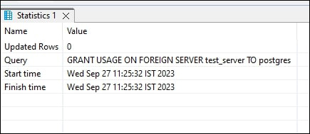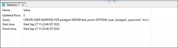Create user mapping for Postgres server test_server options (user ‘postgres’, password ‘****’)