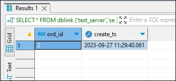 Select * from dblink (‘test_server’,’select ord_id, create_ts from as public.orders’) data(ord_id varchar,create_ts timestamp)