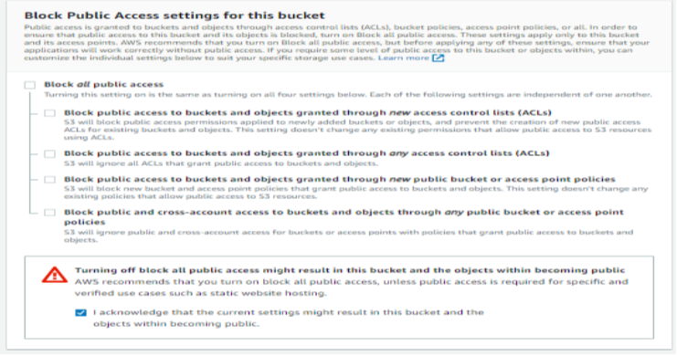 Step 2: Uncheck the block of all public access and acknowledge it so that resources in this bucket can be accessed via the Internet.