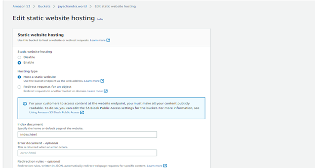 Step 4: Open the bucket you just created from the console and click on properties -> Scroll down completely -> Click on edit “Static Website Hosting” -> Select as below and click on save changes.