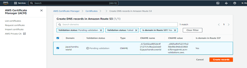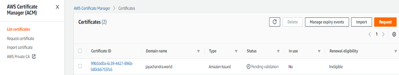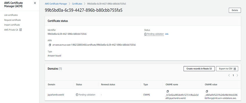 On the next screen, you will see the certificate status is “pending validation.” For it to get validated, it needs to be linked it with the Route 53 records, and we can do that by clicking on the “Certificate ID.”