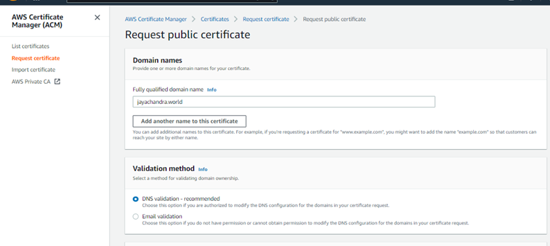 Certificates -> Request -> Select “Request a Public Certificate” and click on next.