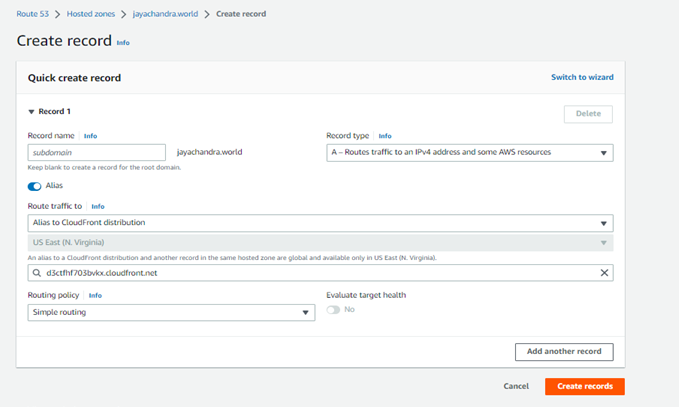 - Now, Click -> Create a record -> Choose Simple routing, click Next, and then Define new record.