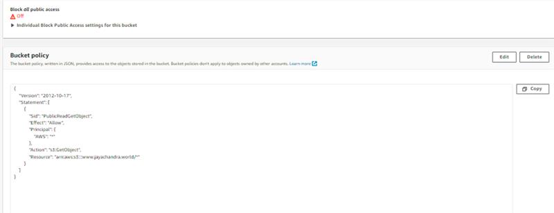 Step 5: Finally, edit the bucket policy to allow anyone to access resources under our bucket with this policy. Change the resource URL as per your domain.