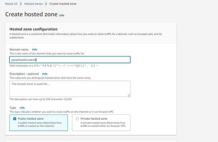 Step 6: Search for Route 53, click on Hosted Zones in the left panel, and create a hosted zone. Then automatically, two records will be created, i.e., NS and SOA.