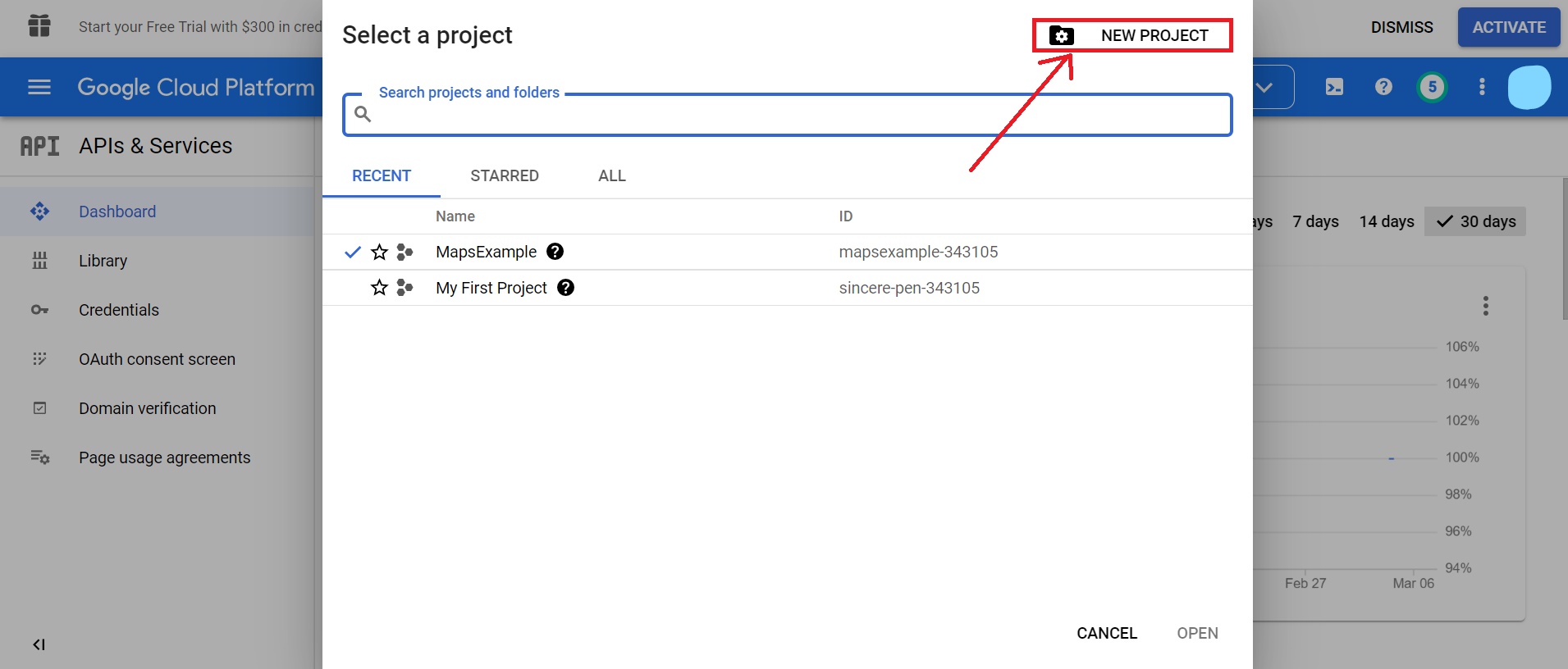 • Open the created project and navigate to API services a Libraries -> Enable the Directions API and Geolocation API.