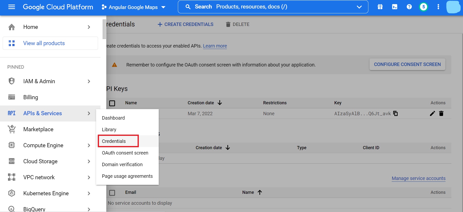 • Navigate to APIs & Services a Credentials a Create credentials a Select -> API key