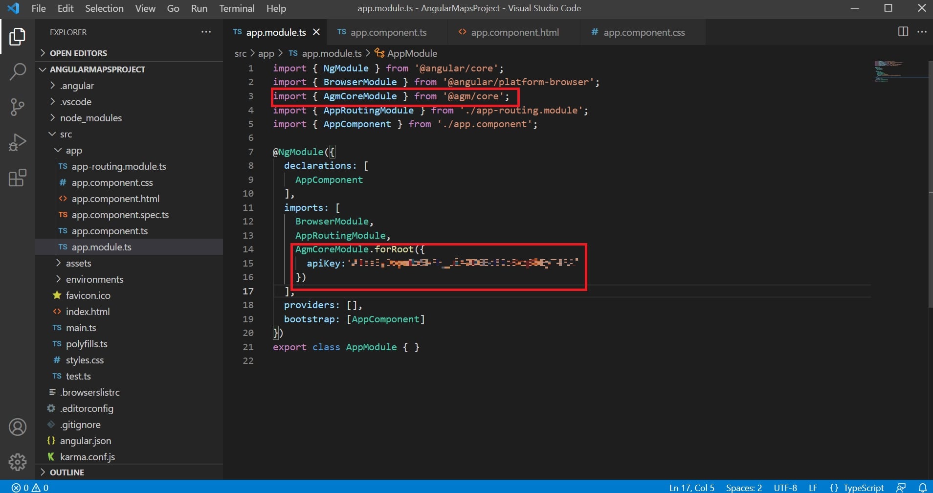 AgmCoreModule. forRoot ({apikey: ‘PASTE-YOUR-API-KEY-HERE’})]