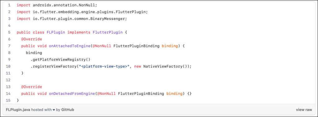 Register the plugin by modifying the plugin`s main file (FLPlugin.java) under the android/src/main/…/FLPlugin.java folder with the below changes.