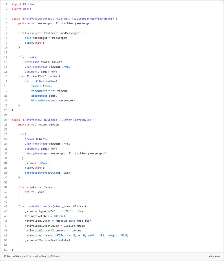 Create a file under ios/classes with two classes in it, one for factory and the other for platform view. The factory class creates the platform view and the platform view class provides the reference to the UIView and the below code implementation in it.